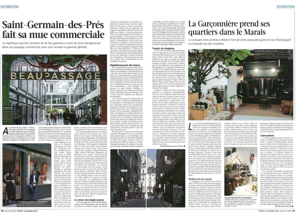 Article paru le 6 novembre 2018 dans le « Journal du Textile » n°2397, dans lequel Benjamin Robine est interrogé sur l’évolution de la commercialité du quartier Saint-Germain des Prés :