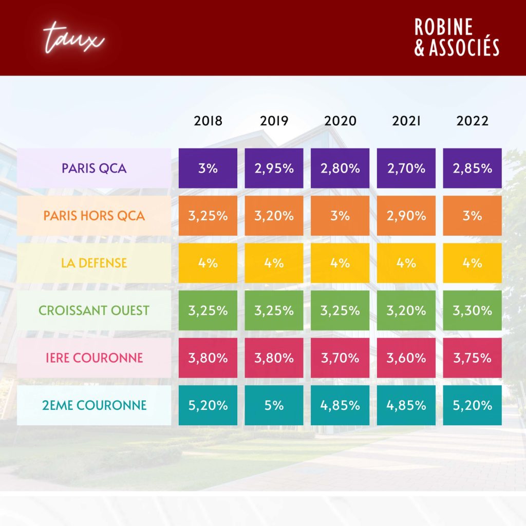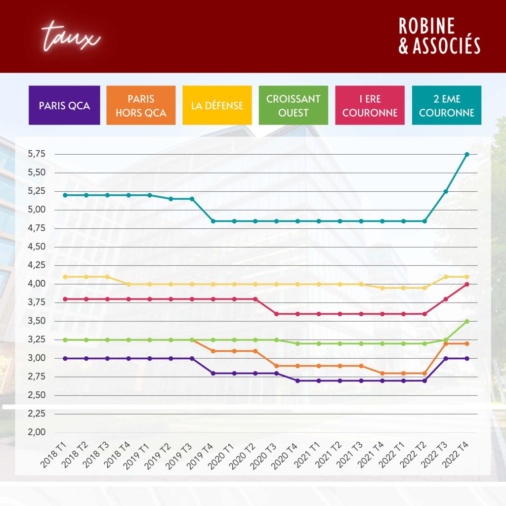 Bureaux – Évolution des taux de rendement prime de 2018 à 2022