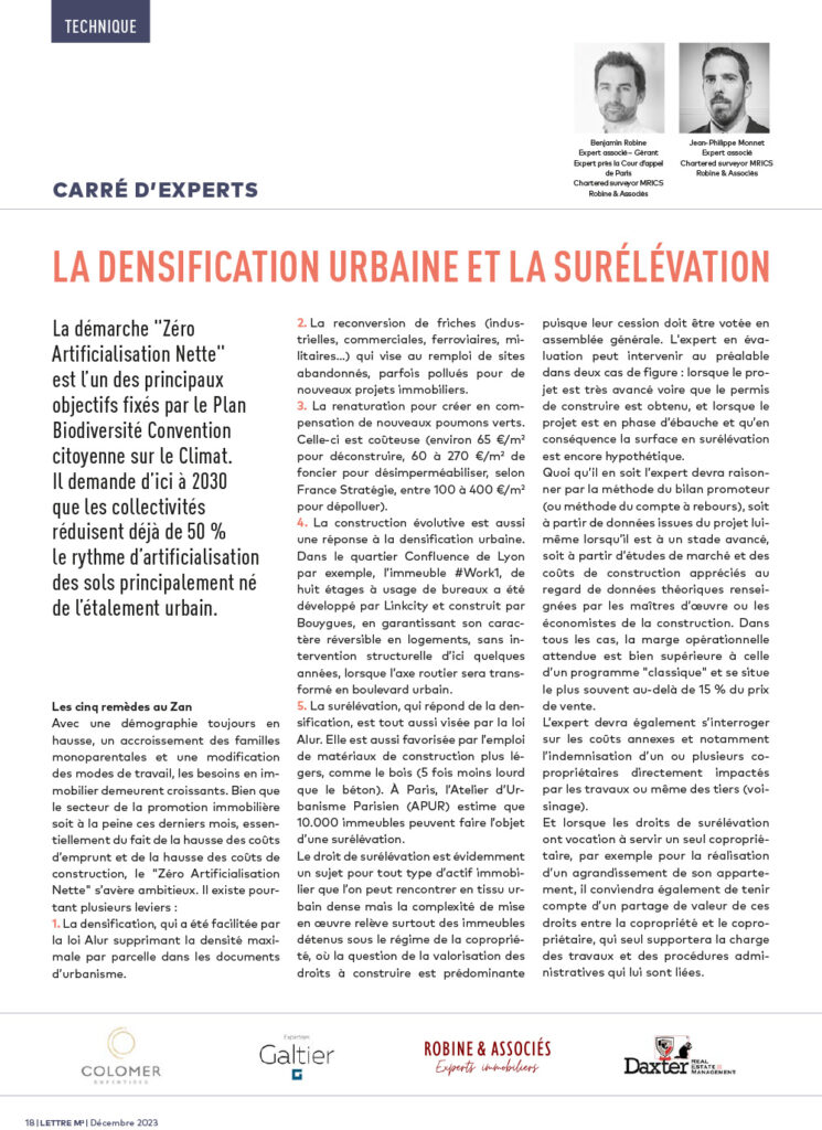 Lettre M² – La densification urbaine et la surélévation par Jean-Philippe MONNET – MRICS et Benjamin ROBINE à retrouver dans le Carré d’experts de décembre