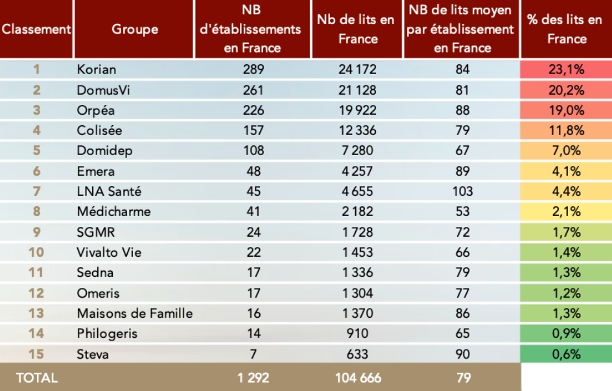 Les groupes CLARIANE (ex-KORIAN), ORPEA et DOMUS VI gèrent environ 2/3 des lits d’EHPAD du secteur privé lucratif en France.
