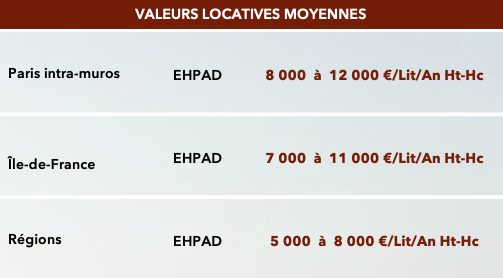 - Des valeurs vénales de murs estimées sur la base de taux de rendement de 6% minimum considérant l’actuelle décompression des taux. Le marché de l’investissement demeure porteur avec le vieillissement de la population déjà évoqué plus haut,