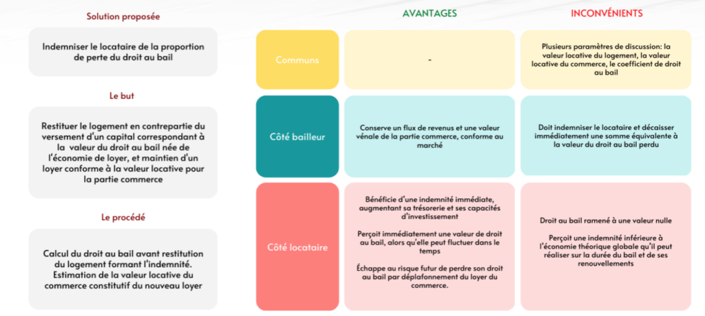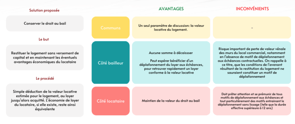 Dès lors que les conditions sont remplies et que le bail en cours procure une économie de loyer, la reprise du logement par le locataire devrait entrainer une correction du loyer de renouvellement de la partie commerce, lui permettant ainsi de conserver ses avantages économiques et donc son droit au bail.