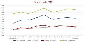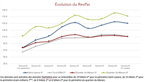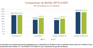 Sur les deux dernières semaines d’octobre, il est observé une baisse du RevPar moyen d’environ 5% par rapport à cette même semaine de 2019.